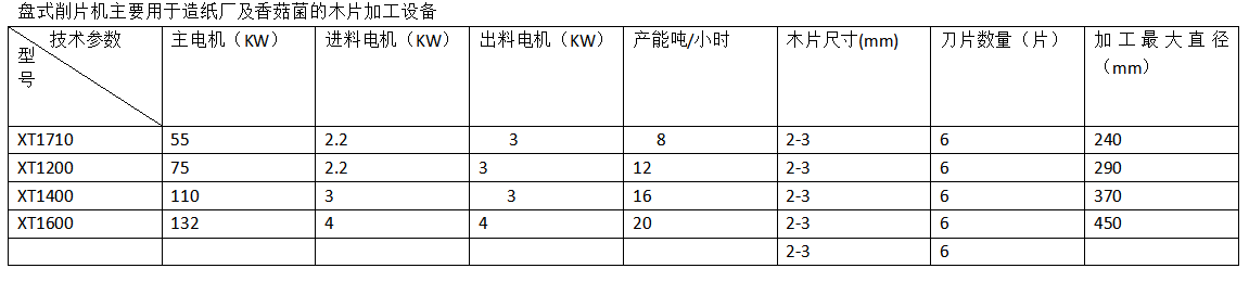 盤式削片機主要用途為造紙廠、硅廠、高密度板廠、香菇菌等削片加工的專用設備,加工原料廣泛于各種樹木及竹子,機型分XT1000、XT1200、XT1400、XT1600、XT1800型,刀片數量常用為3--6片,可與木材剝皮機組成流水線使用,產量每小時8--30噸。